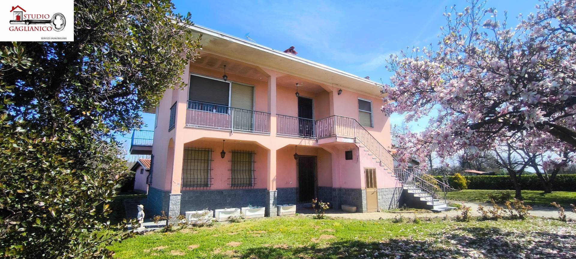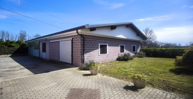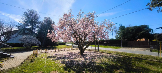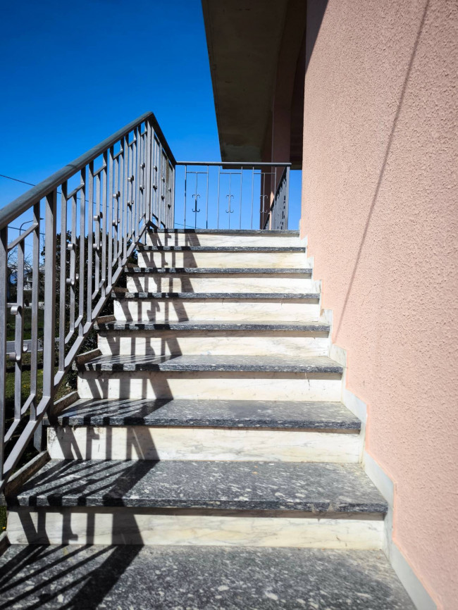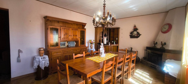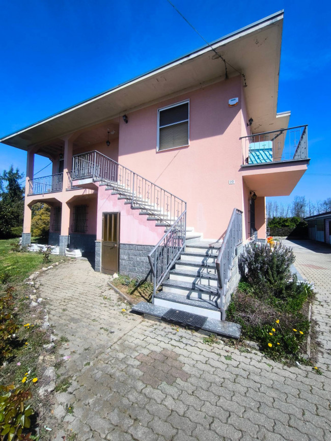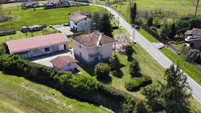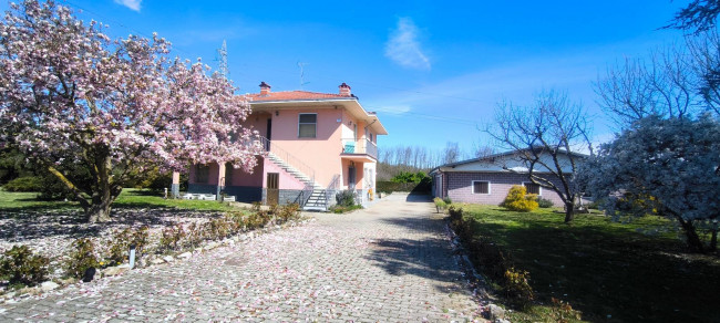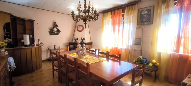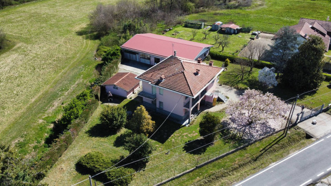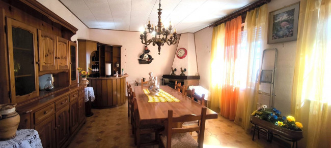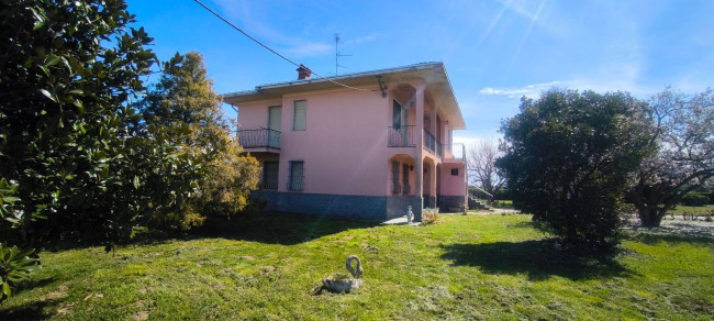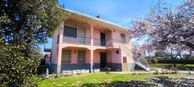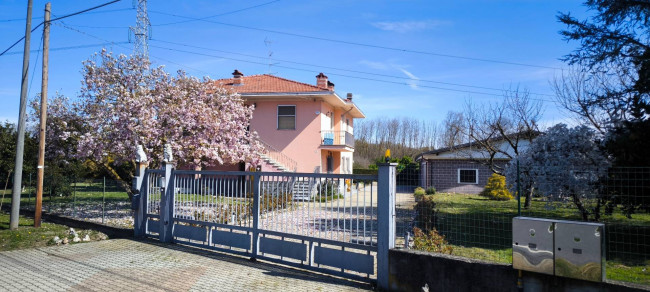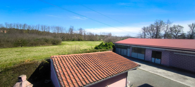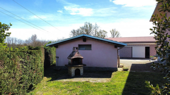 Casa indipendente bifamiliare composta da due appartamenti, uno al piano terreno e uno al piano primo, ciascuno con ingresso autonomo. L'alloggio al piano terra è composto da un ampio ingresso, soggiorno doppio con camino, cucina abitabile, tre camere da letto, bagno padronale, sia con vasca che doccia e secondo bagno di servizio. Al piano primo abbiamo il secondo alloggio con accesso dalla terrazza, soggiorno con camino, cucina abitabile, due camere, bagno con doccia e balconi che servono sia la zona giorno che la zona notte. L'immobile si presente in buono stato d'uso, con i bagni ristrutturati recentemente e gli infissi esterni in legno con doppi vetri. Riscaldamento con due caldaie a metano, una per ciascun appartamento. Giardino di circa 2.000 metri quadri, recintato e con accesso da cancello automatizzato, e due bassi fabbricati a corredo, uno di 250 metri quadri uso deposito/magazzino e l'atro di 25 metri quadri uso autorimessa.
