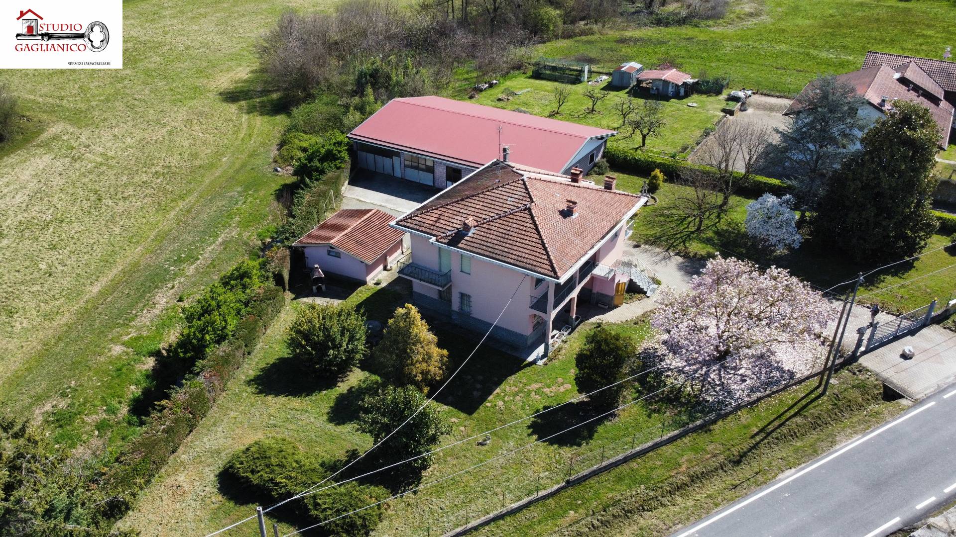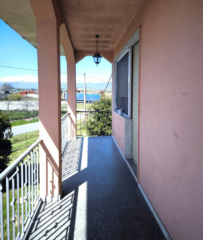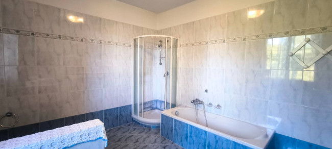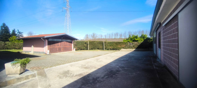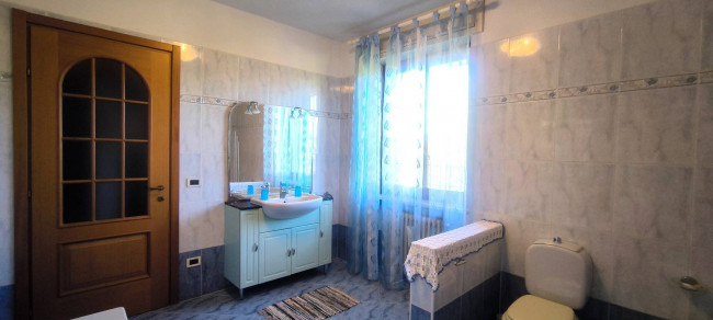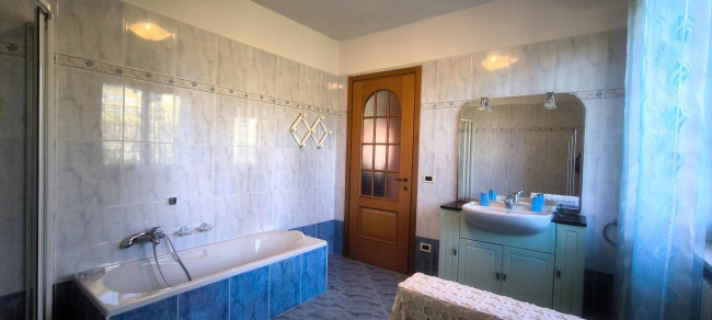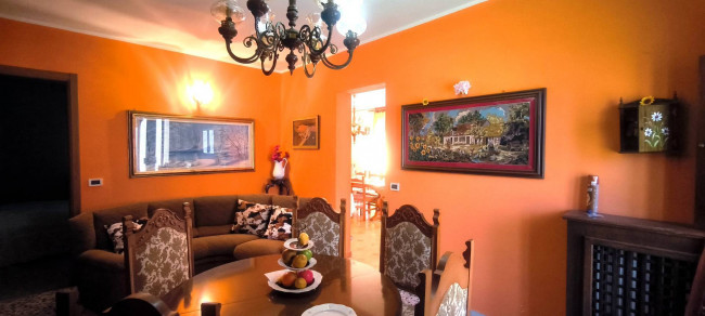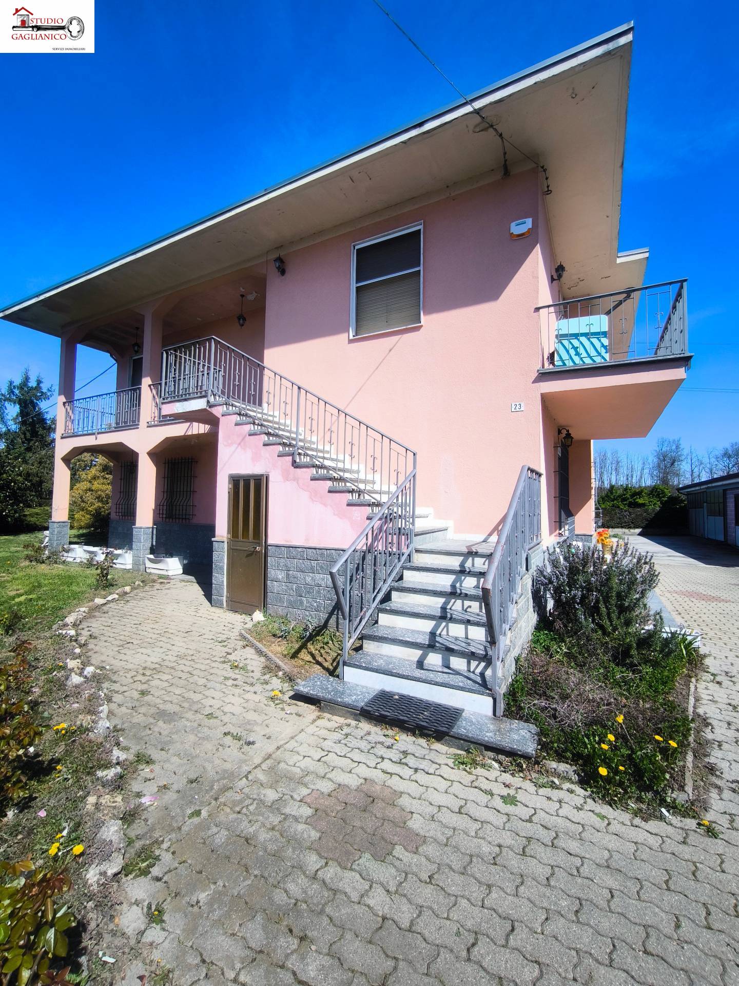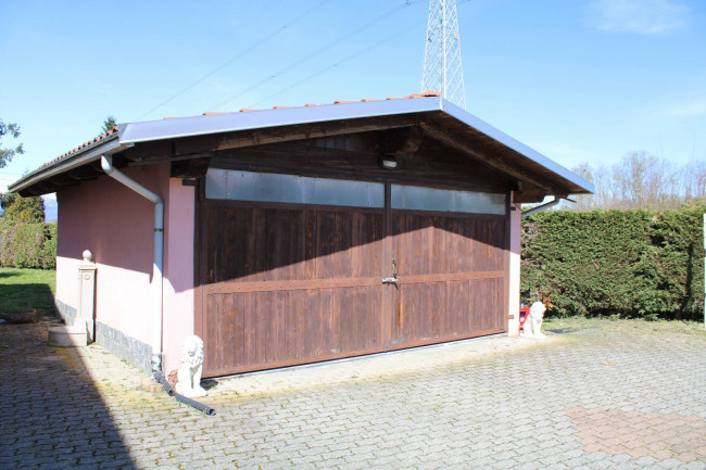 Casa indipendente bifamiliare composta da due appartamenti, uno al piano terreno e uno al piano primo, ciascuno con ingresso autonomo. L'alloggio al piano terra è composto da un ampio ingresso, soggiorno doppio con camino, cucina abitabile, tre camere da letto, bagno padronale, sia con vasca che doccia e secondo bagno di servizio. Al piano primo abbiamo il secondo alloggio con accesso dalla terrazza, soggiorno con camino, cucina abitabile, due camere, bagno con doccia e balconi che servono sia la zona giorno che la zona notte. L'immobile si presente in buono stato d'uso, con i bagni ristrutturati recentemente e gli infissi esterni in legno con doppi vetri. Riscaldamento con due caldaie a metano, una per ciascun appartamento. Giardino di circa 2.000 metri quadri, recintato e con accesso da cancello automatizzato, e due bassi fabbricati a corredo, uno di 250 metri quadri uso deposito/magazzino e l'atro di 25 metri quadri uso autorimessa.