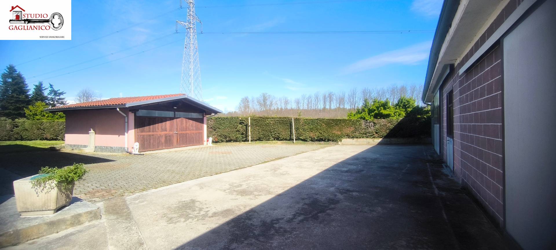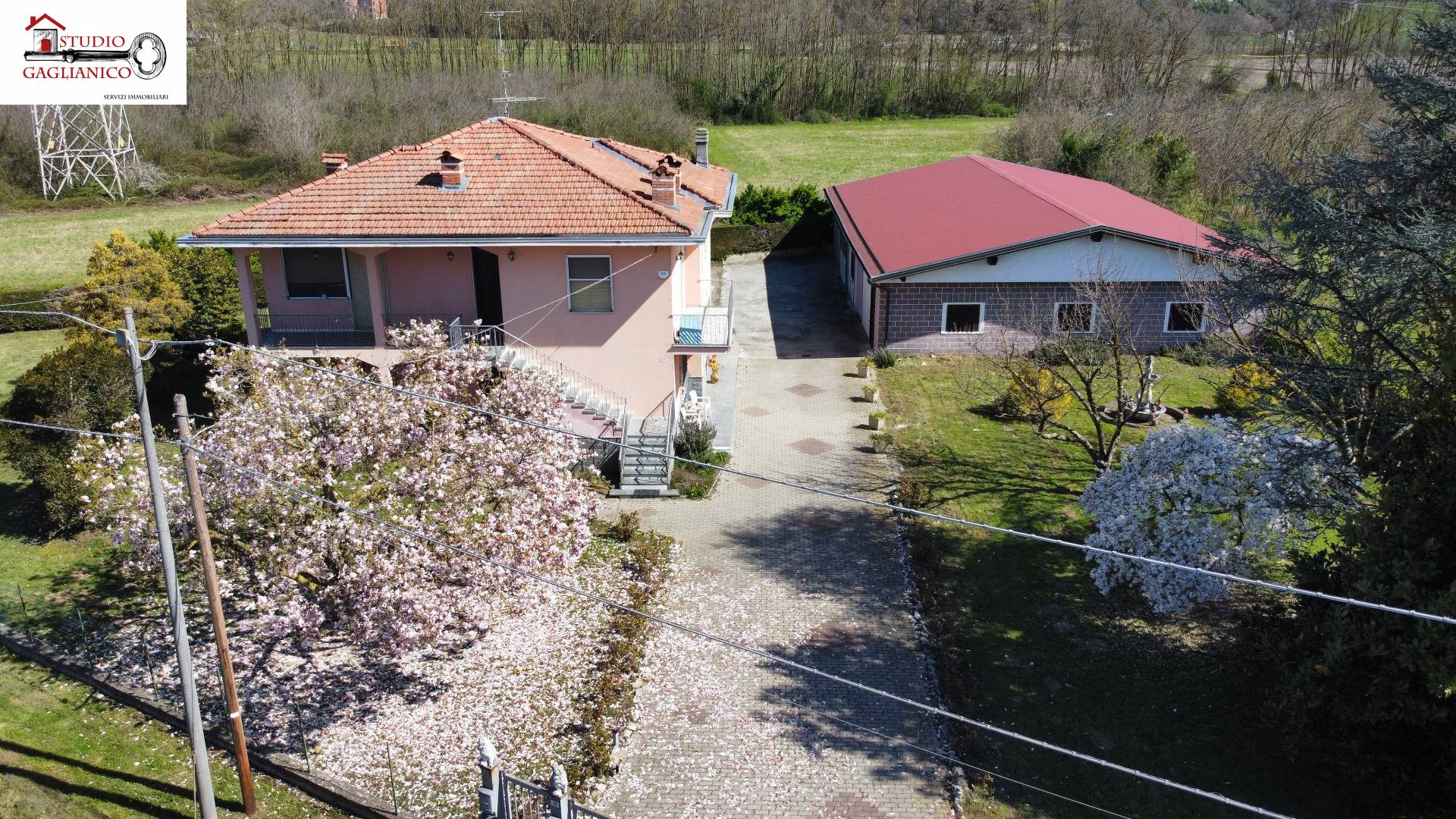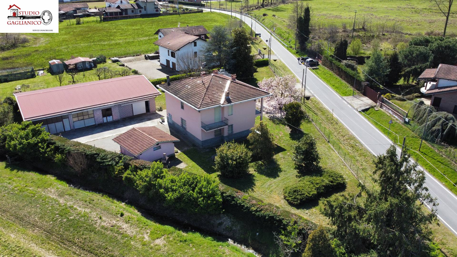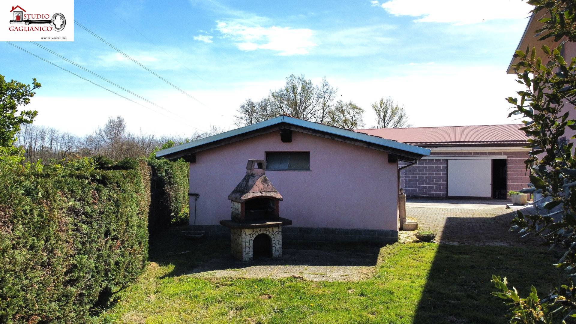 Casa indipendente bifamiliare composta da due appartamenti, uno al piano terreno e uno al piano primo, ciascuno con ingresso autonomo. L'alloggio al piano terra è composto da un ampio ingresso, soggiorno doppio con camino, cucina abitabile, tre camere da letto, bagno padronale, sia con vasca che doccia e secondo bagno di servizio. Al piano primo abbiamo il secondo alloggio con accesso dalla terrazza, soggiorno con camino, cucina abitabile, due camere, bagno con doccia e balconi che servono sia la zona giorno che la zona notte. L'immobile si presente in buono stato d'uso, con i bagni ristrutturati recentemente e gli infissi esterni in legno con doppi vetri. Riscaldamento con due caldaie a metano, una per ciascun appartamento. Giardino di circa 2.000 metri quadri, recintato e con accesso da cancello automatizzato, e due bassi fabbricati a corredo, uno di 250 metri quadri uso deposito/magazzino e l'atro di 25 metri quadri uso autorimessa.